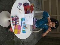 That's probably because she was too busy knitting the scarf (three days of child labor) and weaving the potholders. Her asking prices were ambitious: $15 for the scarf, $10 for the potholders, $10 for the “complicated” bracelets, $5 for the simpler ones, and $1 for the greeting cards. A Cole Valley girl to the core.