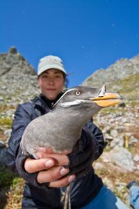 Former intern Jen Aragon holds a Rhinoceros Auklet in 2011 (Maps for Good/Point Blue/USFWS)