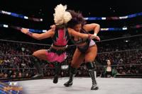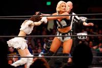 Riho (left) and Toni Storm (right) during their match at the All Elite Wrestling (AEW) Dynamite event at the Cow Palace on Wednesday, March 1, 2023.