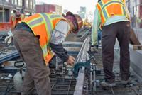 Workers drill holes for bolts through sections of steel rails slated to be joined together inside the worksite just north of Townsend.