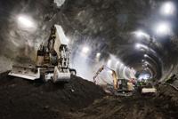 Excavation equipment continues to remove material from the invert or lower area of the oval-shaped station and track crossover cavern in the C…